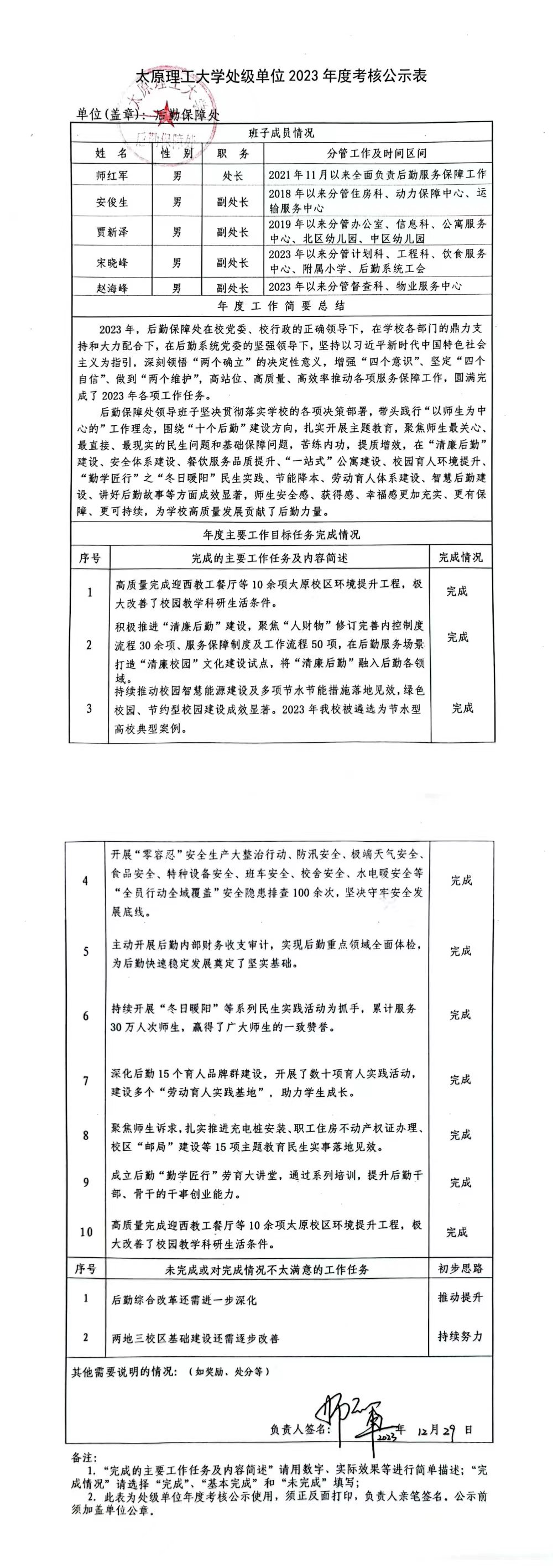 后勤保障处2023年度考核公示表