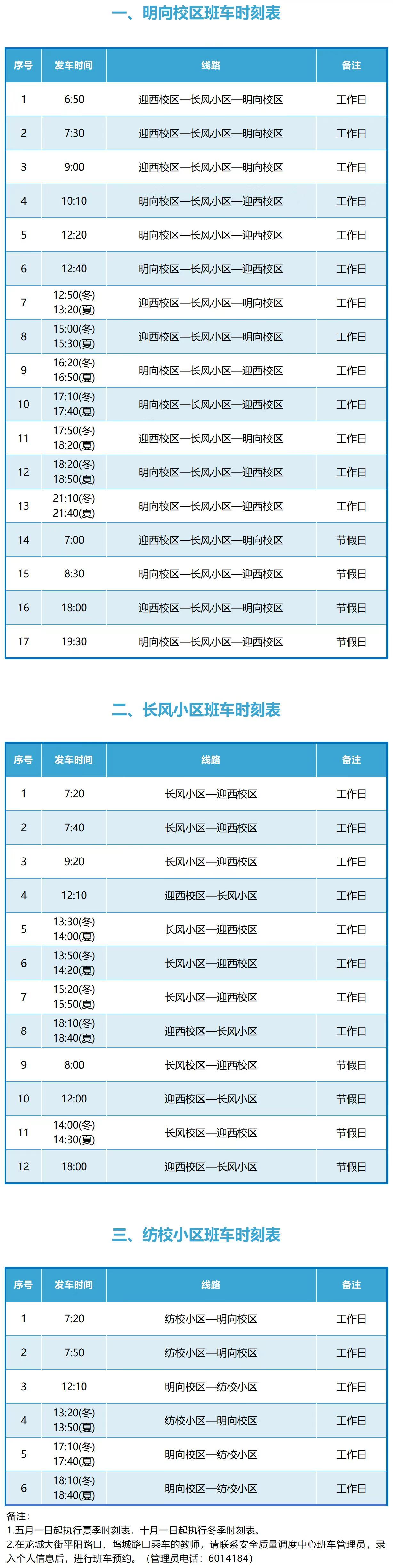 根据学校工作安排,自2025年10月9日起,我校明向校区行政人员上班时间统一调整为上午8:30——12:00,14:00——17:00。为配合新的工作时间安排,后勤保障部对班车运行时间也相应进行了调整,具体安排如下: