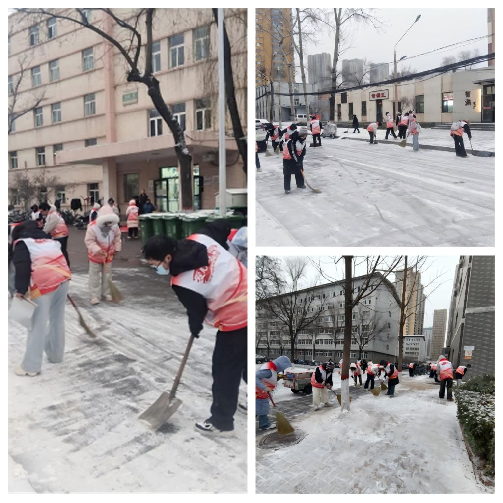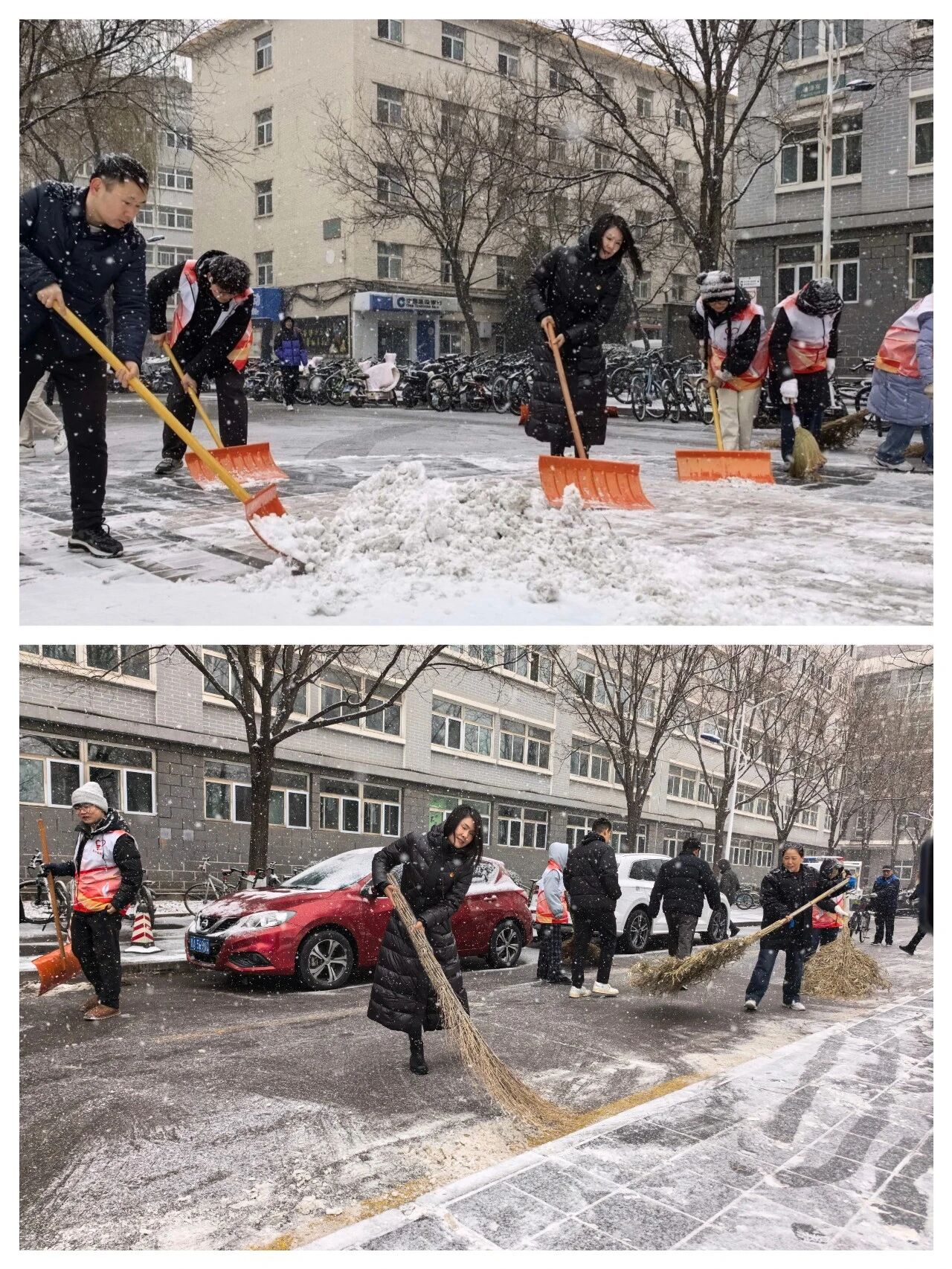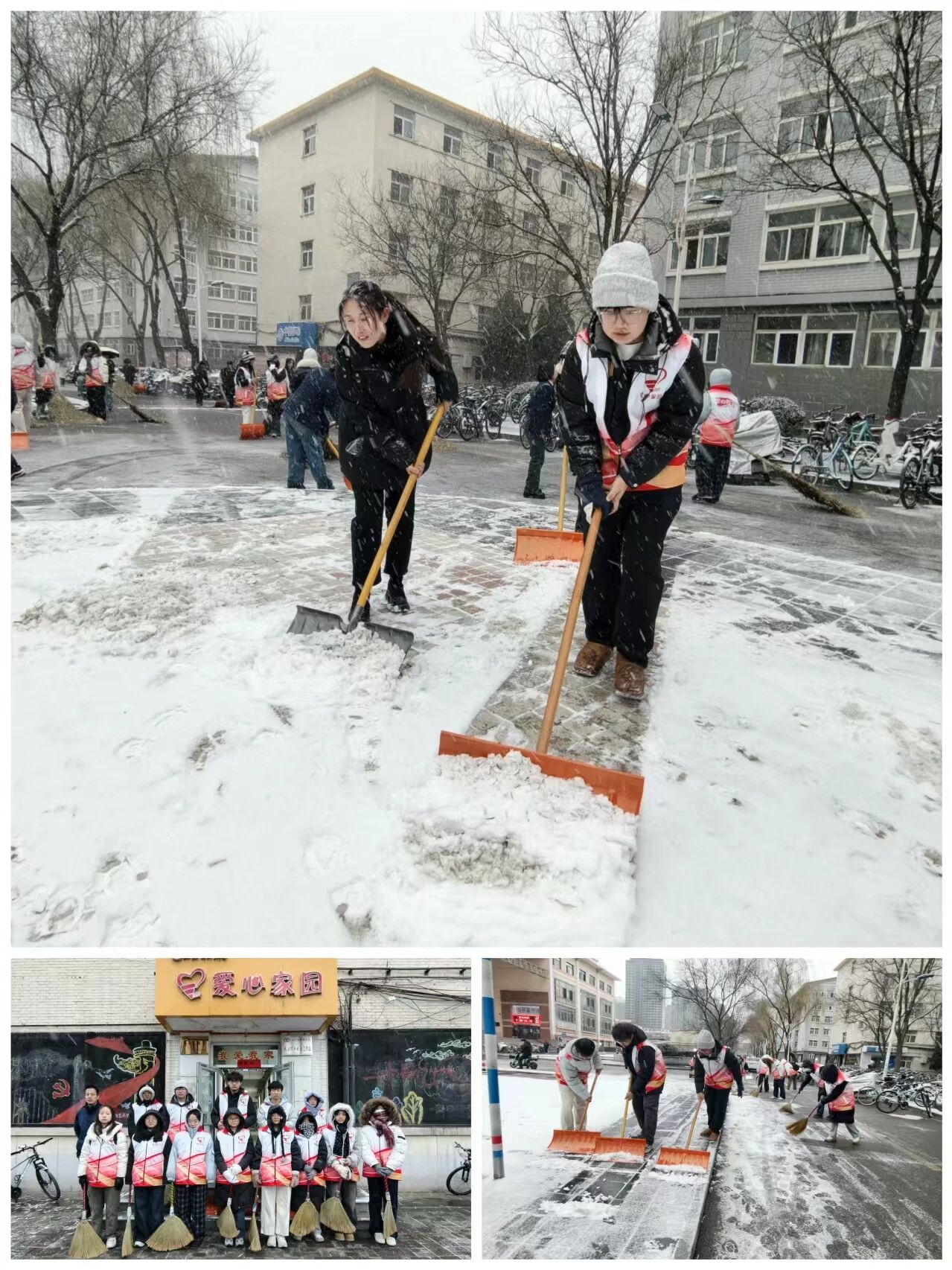与此同时,一抹抹鲜亮的“志愿红”也成为校园里的暖心风景。爱心家园组织160余名学生志愿者开展校园除雪行动,全力保障师生安全出行。志愿者们利用课余时间,拿起铁锹、扫帚等工具有序对校内重点区域开展清扫,干劲十足、热情高涨,用志愿行动诠释青春使命与志愿精神,为冬日校园注入了浓浓暖意。